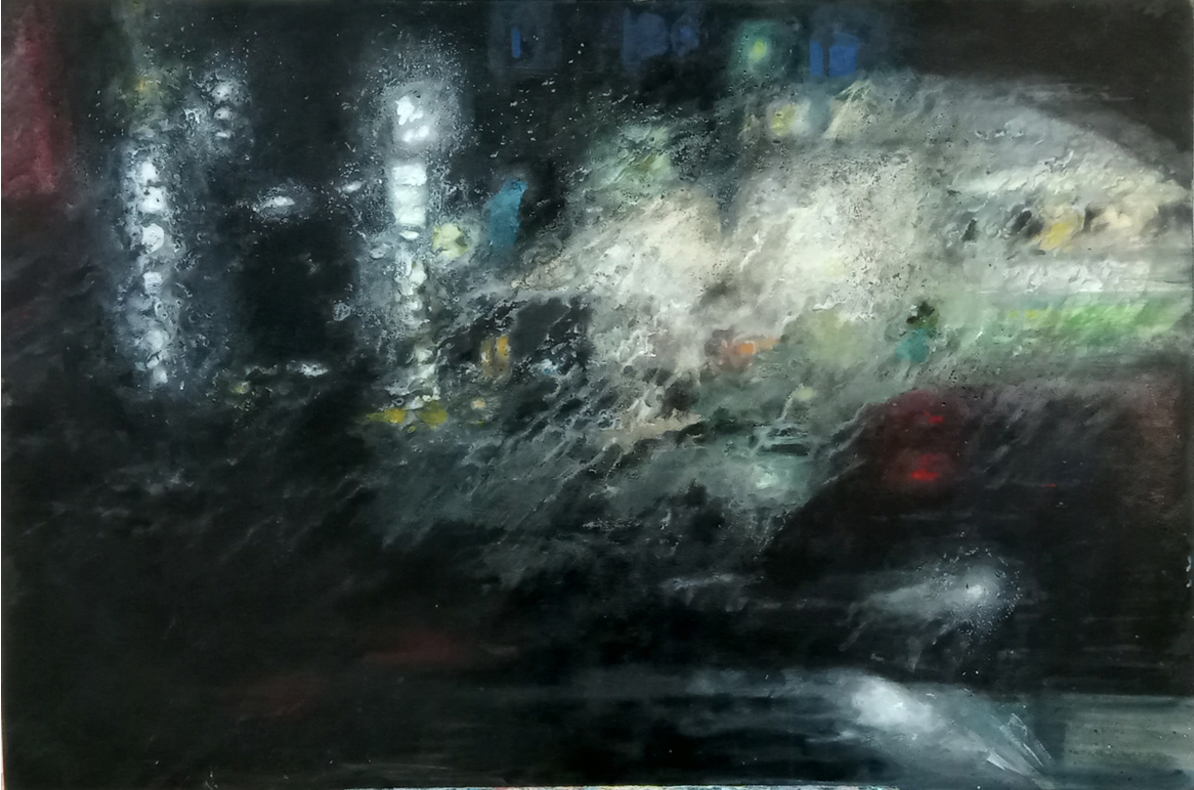 En este incesante hacer y deshacer, el mundo se presenta diluido y líquido.Vivimos sumidos en el mito de la caverna, percibiendo el mundo en forma de sensaciones, vagas sombras o intensas luces, donde los faros de la ciudad deslumbran en la noche y la lluvia disuelve las formas contra la ventana.